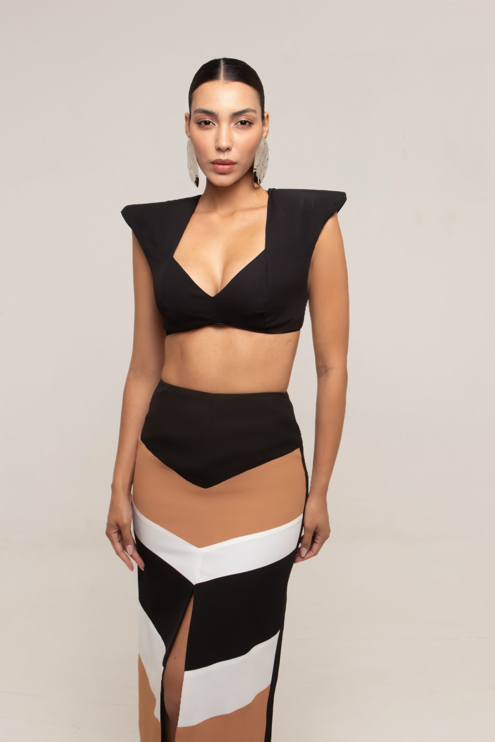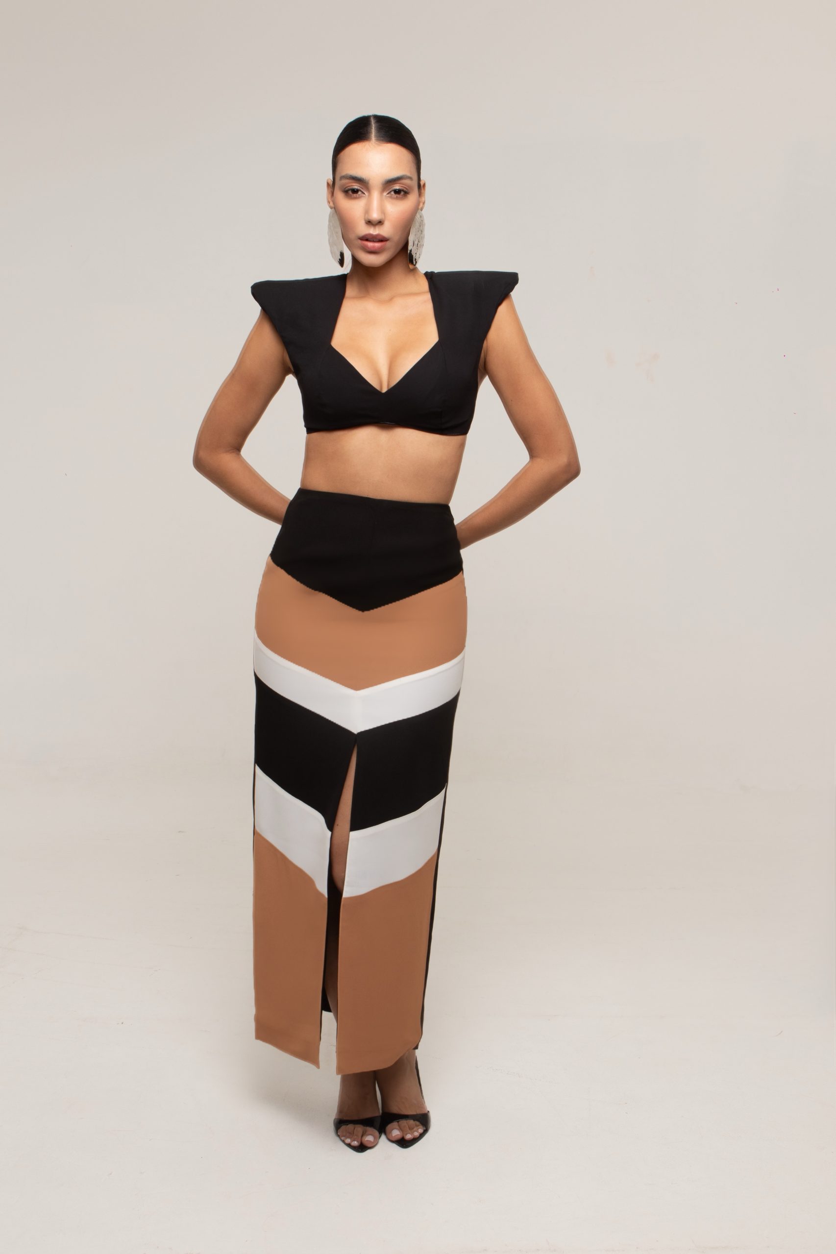 Saia Reta Solar Tricolor, A saia SOLAR tricolor possui atemporalidade e elegância da modelagem reta, acabamento forrado, fenda frontal, comprimento longette, possui a vantagem de ser uma peça funcional podendo ser usada com o top SOLAR tricolor, que juntos se tornam um vestido.